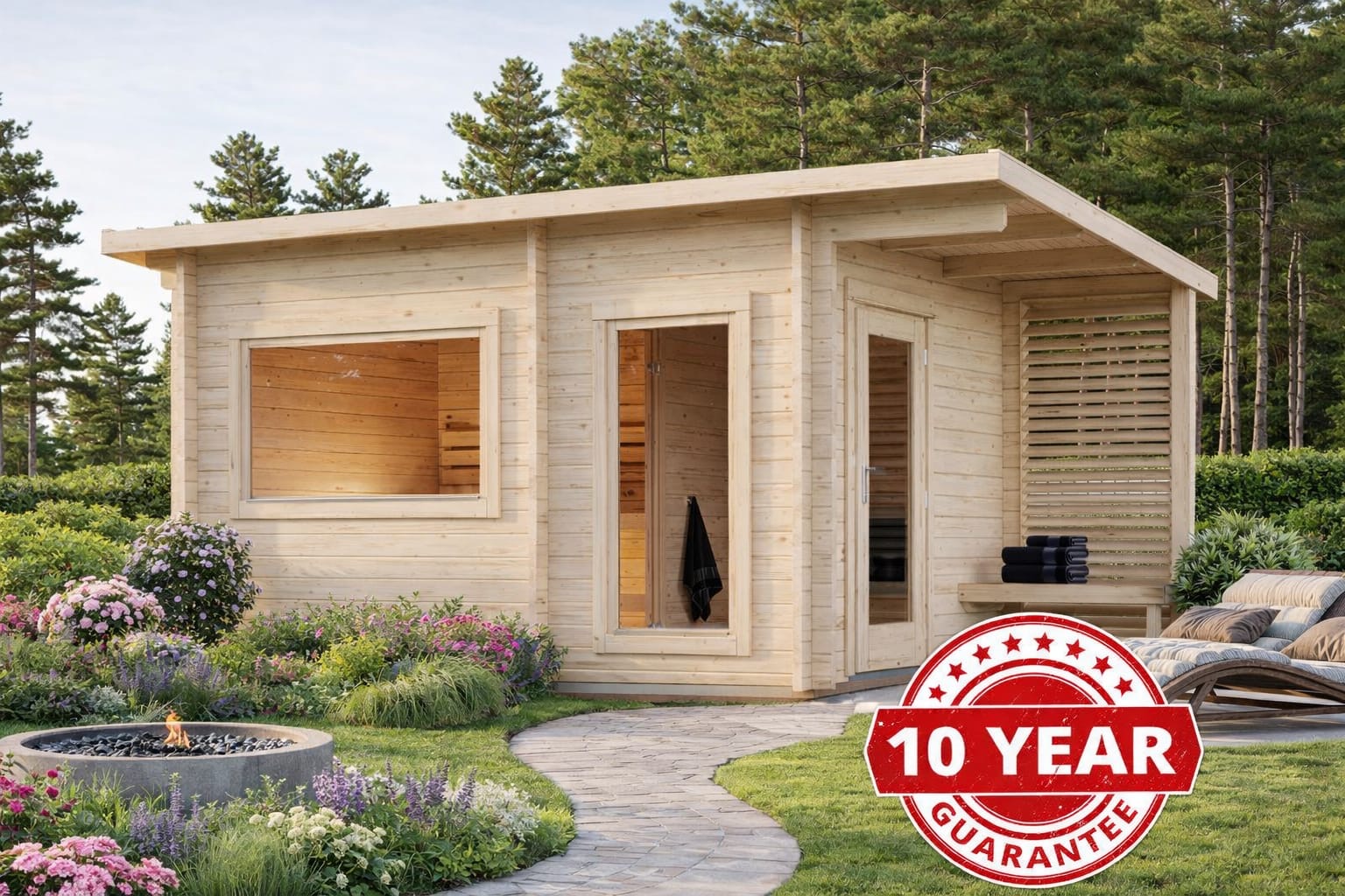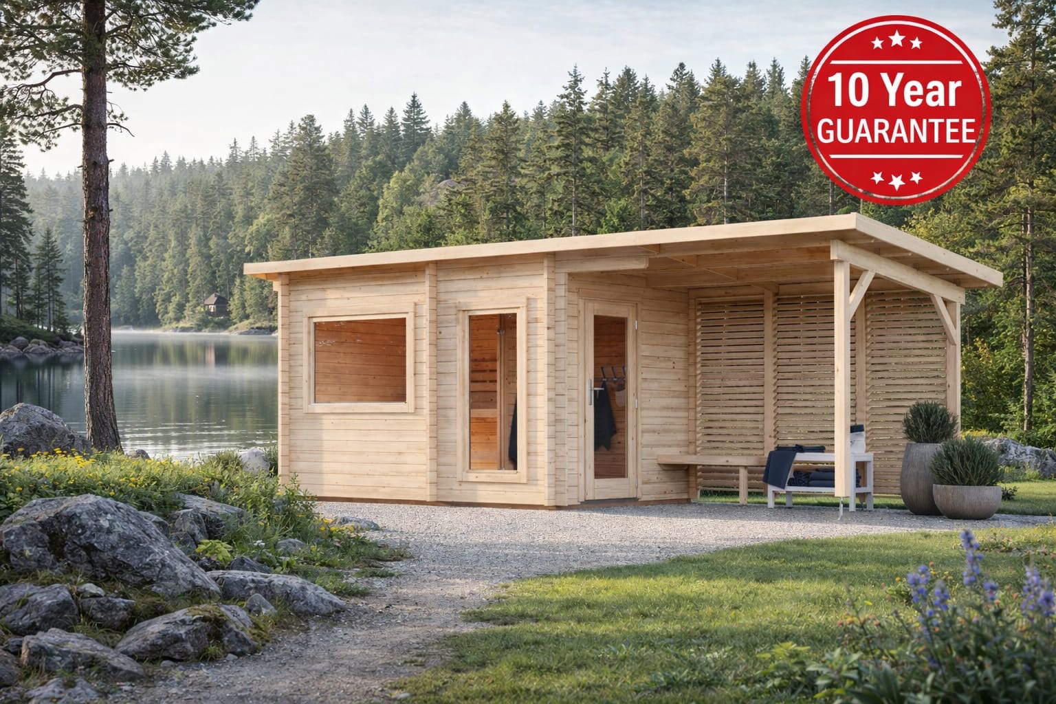 The Aspen Sauna collection offers comfort, wellness, and style for your outdoor living space. Each sauna is made from 44 mm interlocking Nordic spruce logs, providing strength, insulation, and a natural finish that blends beautifully into any garden.