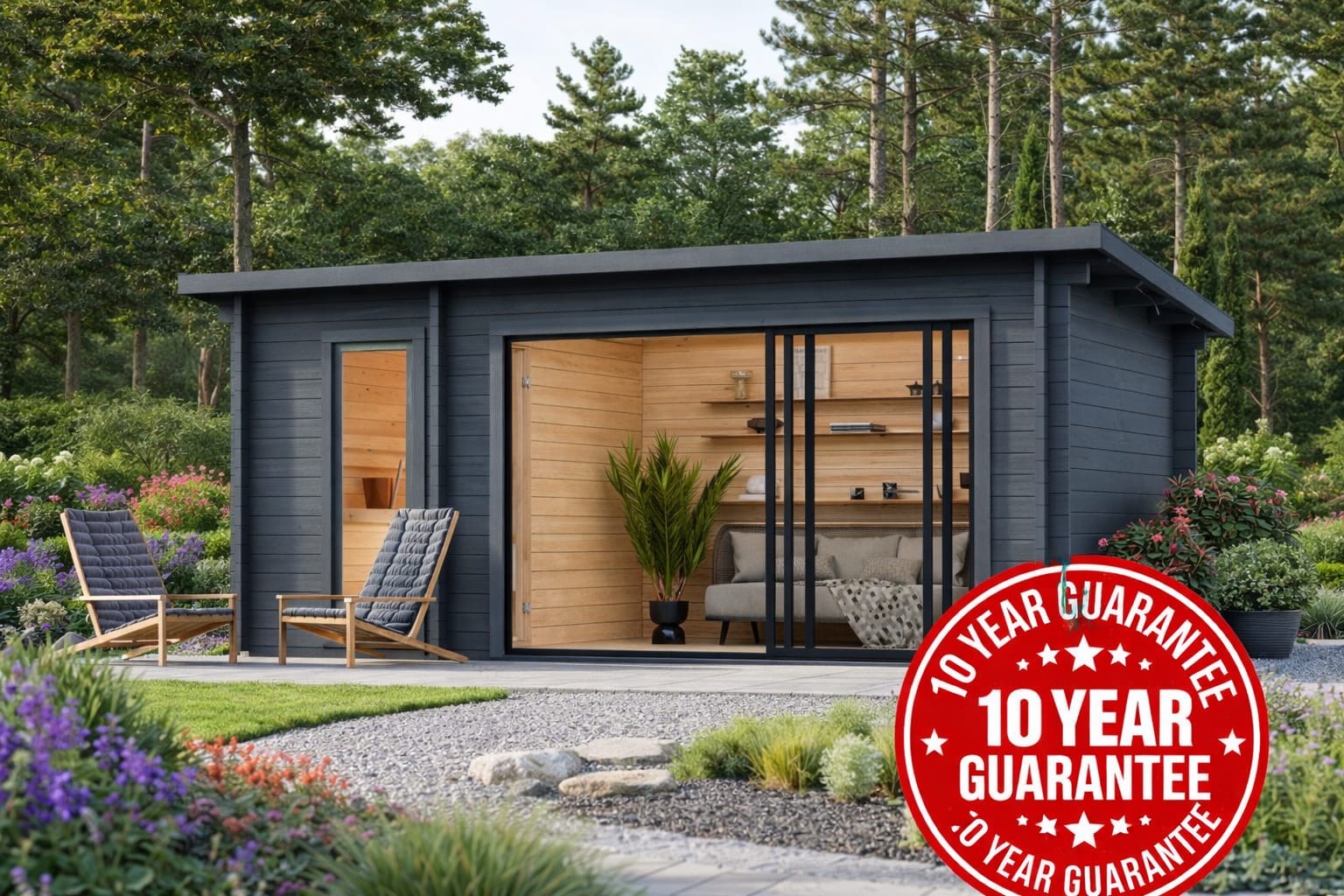 The Aspen Sauna range is available in four sizes, from the compact Sanna M for smaller gardens to the spacious Sauna XL and traditional three-room Sauna L. Each model is crafted from 44 mm spruce and designed for comfort, with layouts that include dressing rooms, lounges, or sliding doors. All Aspen saunas come with a 5-year guarantee.